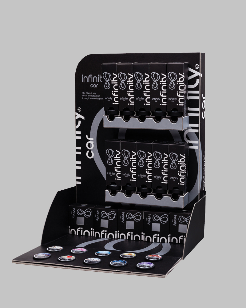 Μία εύκολη λύση για τους πελάτες σας. Το Infinity Car Stand περιέχει 20 Infinitiy Car συσκευές and 12 τεμάχια κάψουλες από όλα τα αρώματα. Κάθε stand επίσης περιέχει 10 δείγματα αρωμάτων, ώστε να διευκολύνουν τους πελάτες να επιλέξουν αυτό που επιθυμούν. Το Stand είναι κομψό και πρακτικό και σχεδιασμένο ώστε να τοποθετείτε εύκολα οπουδήποτε θέλουμε.