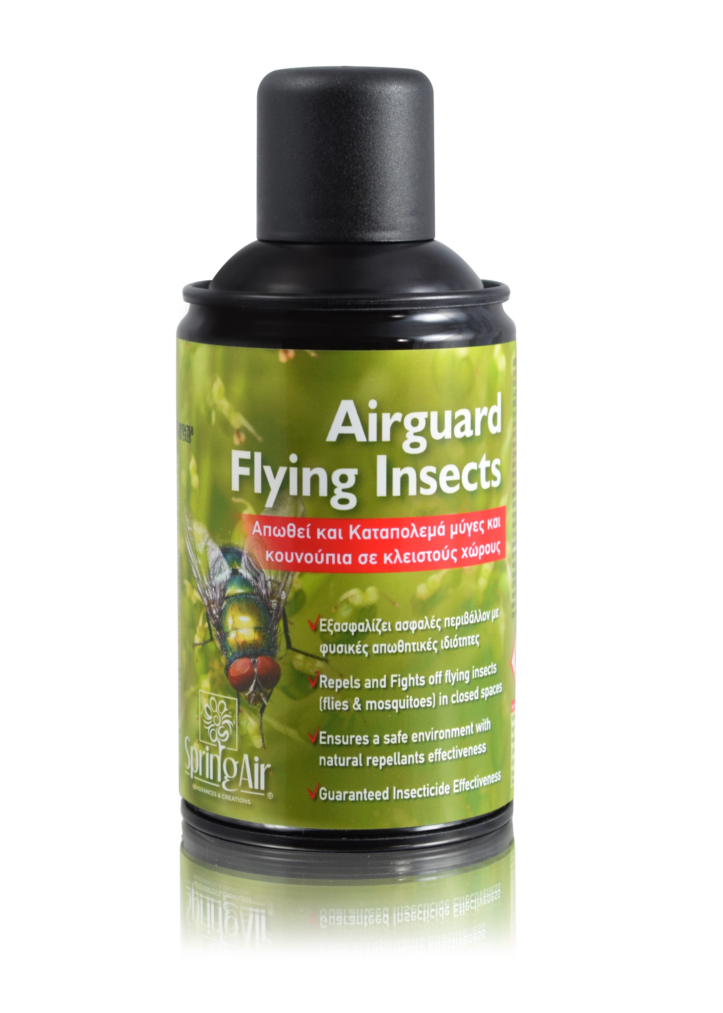 AIRGUARD FLYING INSECTS odbija i tjera sve leteće insekte poput komaraca i muha u zatvorenim prostorima. Prostor će na siguran i prirodan način biti zaštićen od letećih insekata. Ovaj insekticid dizajniran je za sve vrste Smart Air raspršivača (Smart Air Dispensers), u skladu sa svim sigurnosnim zahtjevima. Odobren od strane Ministarstva ruralnog razvoja i hrane Helenske Republike (Hellenic Ministry of Rural Development and Foods).